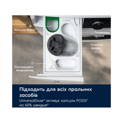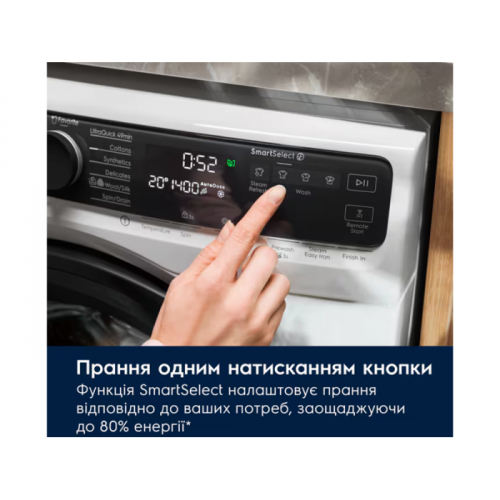 - Програми прання: Cottons, Delicates, Eco 40-60, Hygiene, Джинсові речі, Memory 1 / Favourite 1, Rapid 20 Min, Ополіскування, Віджимання/злив, Sportwear, Синтетика, Ultraquick 59Min, Шерсть